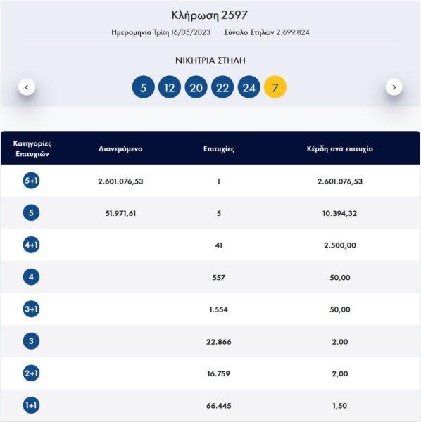 «Ένα (1) τυχερό δελτίο βρέθηκε στην 1η κατηγορία (5+1) κατά τη σημερινή διαλογή της 2597ης κλήρωσης του ΤΖΟΚΕΡ που κερδίζει το ποσό των € 2.601.076,53 και το οποίο φέρει και δύο(2) επιτυχίες στη 2η κατηγορία (5) όπου η κάθε επιτυχία κερδίζει από €10.394,32. Επίσης, τρία(3) τυχερά δελτία βρέθηκαν στην 2η κατηγορία (5), τα οποία κερδίζουν το ποσό των € 10.394,32 για κάθε επιτυχία. Το ποσό που θα μοιρασθούν οι τυχεροί της 1ης κατηγορίας στην επόμενη κλήρωση της ΠΕΜΠΤΗΣ 18/05/2023 είναι €600.000 τουλάχιστον».