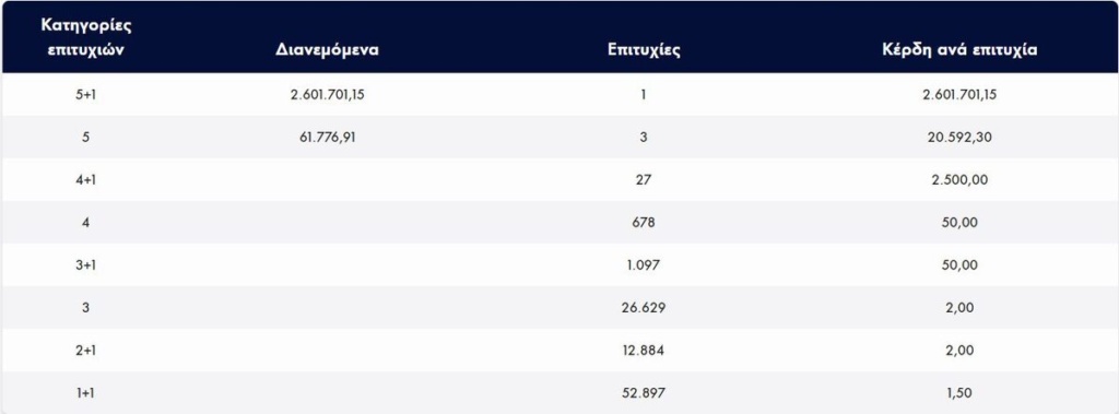 Η κλήρωση της Πέμπτης έβγαλε και τρεις νικητές της δεύτερης κατηγορίας (5αρια), οι οποίες κερδίζουν από 20.592,30. Τα τρία δελτία συμπληρώθηκαν σε Αιτωλοακαρνανία, Πιερία και Καβάλα.