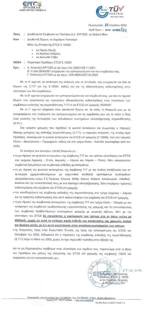 Συγκεκριμένα, στην επιστολή του αναφέρει ότι διαφωνεί με τη μη τήρηση του φυσικού αντικειμένου της σύμβασης 717 και του τρόπου λειτουργίας του ETCS στα τμήματα Αχαρνές – Οινόη, Δομοκός – Λάρισα και Λάρισα – Πλατύ, διότι καταργούνται συμβατικά δρομολόγια και συμβατικές ενδείξεις φωτοσημάτων.