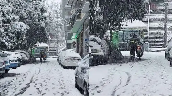 Διανομέας δουλεύει με τον χιονιά και αναγκάζεται να κάνει διανομή, όχι πάνω στο μηχανάκι, αλλά παίρνοντας το όχημα στα χέρια.