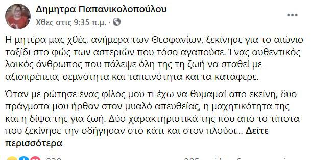Η μητέρα μας χθες, ανήμερα των Θεοφανίων, ξεκίνησε για το αιώνιο ταξίδι στο φως των αστεριών που τόσο αγαπούσε. Ένας αυθεντικός λαϊκός άνθρωπος που πάλεψε όλη της τη ζωή να σταθεί με αξιοπρέπεια, σεμνότητα και ταπεινότητα και τα κατάφερε.