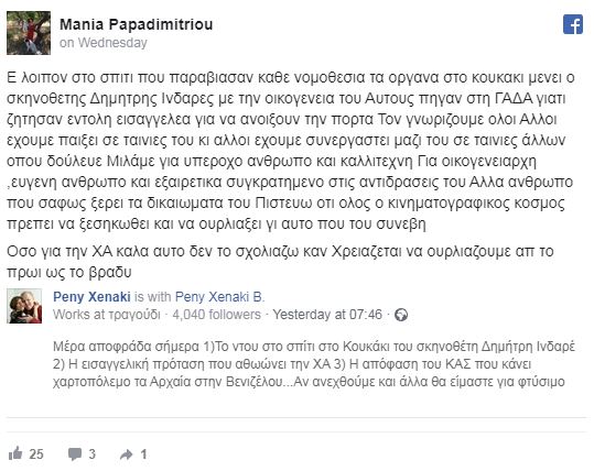 «Ε λοιπον στο σπιτι που παραβιασαν καθε νομοθεσια τα οργανα στο κουκακι μενει ο σκηνοθετης Δημητρης Ινδαρες με την οικογενεια του Αυτους πηγαν στη ΓΑΔΑ γιατι ζητησαν εντολη εισαγγελεα για να ανοιξουν την πορτα Τον γνωριζουμε ολοι Αλλοι εχουμε παιξει σε ταινιες του κι αλλοι εχουμε συνεργαστει μαζι του σε ταινιες άλλων οπου δούλευε.