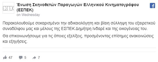 «Παρακολουθούμε σοκαρισμένοι την αδικαιολόγητη και βίαιη σύλληψη του εξαιρετικού συναδέλφου μας και μέλους της ΕΣΠΕΚ Δημήτρη Ινδαρέ και της οικογένειας του. Θα επικοινωνήσουμε για τις όποιες εξελίξεις, προσμένοντας επίσημες ανακοινώσεις και εξηγήσεις».