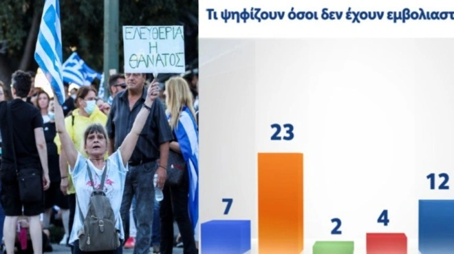 Σύμφωνα με τα στοιχεία της δημοσκόπησης, το 23% όσων δεν έχουν κάνει το εμβόλιο κατά του κoρωνοϊού επιλέγουν ΣΥΡΙΖΑ και μόλις το 7% τη Νέα Δημοκρατία.