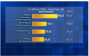 Στο ερώτημα για το ποια είναι η μεγαλύτερη ανησυχία των πολιτών το 84,5% απάντησε η ακρίβεια, οι ανατιμήσεις και ο δύσκολος χειμώνας και το 44,1% τα εθνικά και ελληνοτουρκικά θέματα, το 37,8% λέει ότι τους ανησυχεί η εγκληματικότητα και η βία και το 34% ο πόλεμος στην Ουκρανία.