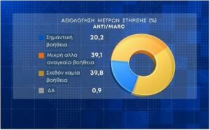 Για το πώς αξιολογούν τα μέτρα στήριξης το 39,8% υποστηρίζουν ότι δεν είναι καμία βοήθεια, το 39,1% τα χαρακτηρίζει μικρή αλλά αναγκαία βοήθεια, ενώ το 20,2% των ερωτηθέντων λένε ότι είναι σημαντική βοήθεια.