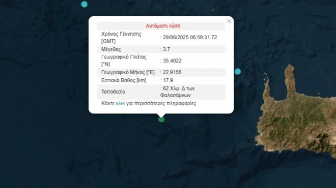 Σύμφωνα με την ενημέρωση του Γεωδυναμικού Ινστιτούτου Αθηνών, η σεισμική δόνηση σημειώθηκε 62 χλμ. δυτικά των Φαλασάρνων στην Κρήτη.