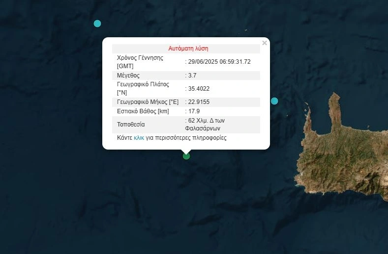 Σύμφωνα με την ενημέρωση του Γεωδυναμικού Ινστιτούτου Αθηνών, η σεισμική δόνηση σημειώθηκε 62 χλμ. δυτικά των Φαλασάρνων στην Κρήτη.