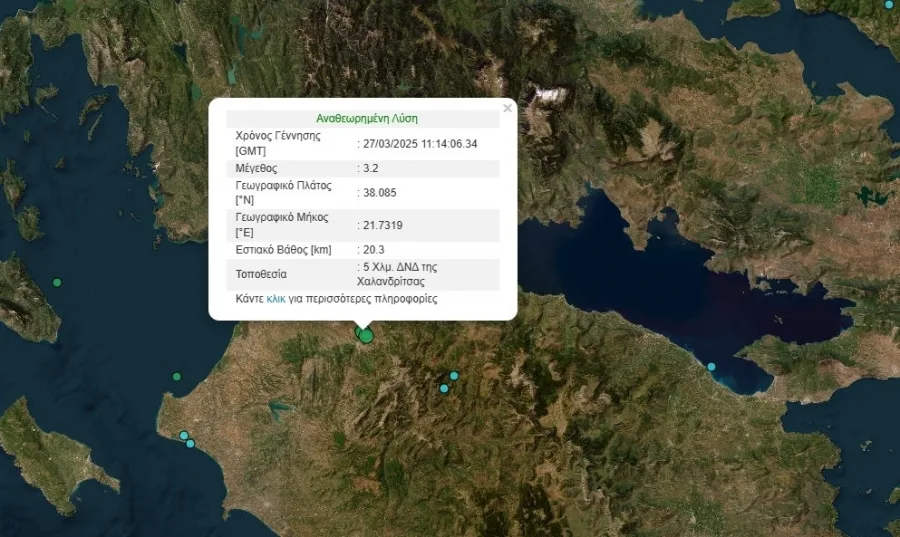 Τρία λεπτά αργότερα, ακολούθησε σεισμός 3,2 βαθμών της κλίμακας Ρίχτερ, με εστιακό βάθος 20,3 χλμ και 5 χλμ ΔΝΔ της Χαλανδρίτσης.
