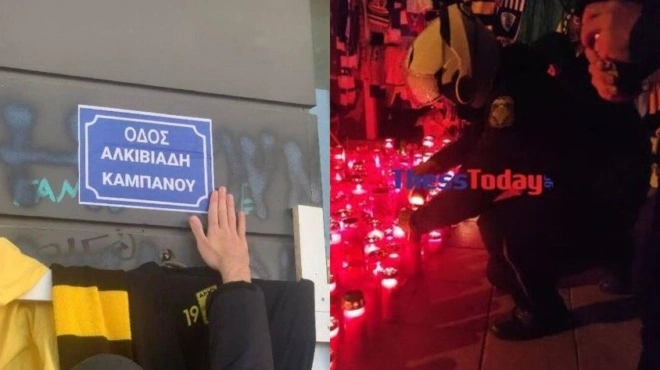 Δολοφονία 19χρονου Άλκη: Λουλούδια στο σημείο όπου ο Άλκης Καμπανός άφησε την τελευταία του πνοή, μετά από το φονικό χτύπημα οπαδών του ΠΑΟΚ, άφησαν δυνάμεις της ομάδας ΔΙ.ΑΣ., στη Θεσσαλονίκη, ενώ φίλοι του Άρη έδωσαν το όνομά του στον δρόμο που δολοφονήθηκε.