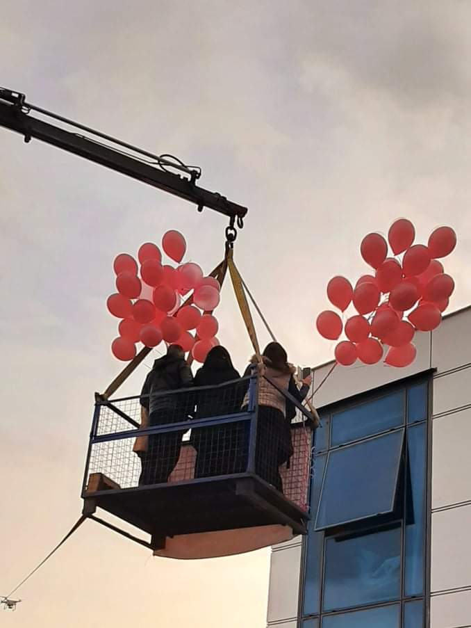 «Ήρθαν εσκεμμένα εκείνη την ώρα να μου μετρήσουν την πίεση και το οξυγόνο για να είμαι απασχολημένη. Ο σύζυγός μου είχε κλείσει και τις κουρτίνες -καθώς ήταν όλα προμελετημένα, και τη στιγμή που μιλούσα με τη μαία, ακούω απ’ έξω μουσική, τραγούδια, κόρνες και φωνές. Ανοίγουν την κουρτίνα, με πηγαίνουν με το κρεβάτι μου δίπλα στο παράθυρο, μου φέρνουν τη μικρή αγκαλιά και βλέπω τα αγαπημένα μου πρόσωπα πάνω σε ένα καλάθι γερανού», περιγράφει η νεαρή μητέρα.