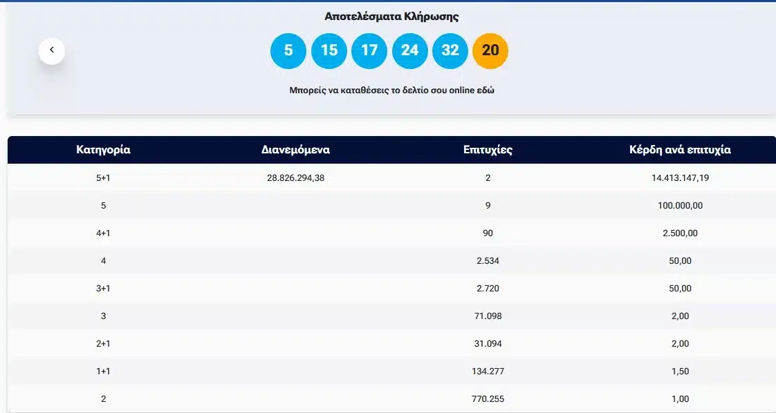 Οι τυχεροί αριθμοί στην κλήρωση Τζόκερ σήμερα ήταν οι: 5, 15, 17, 24, 32 και Τζόκερ το 20.