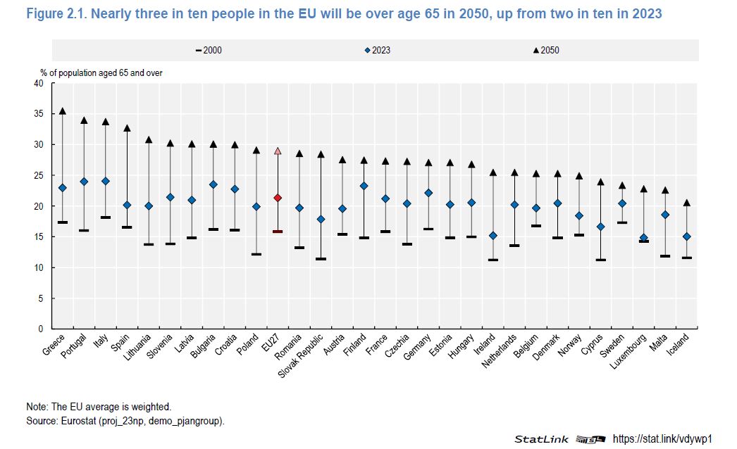 Συνολικά, το ποσοστό των ατόμων ηλικίας άνω των 65 ετών στην ΕΕ παρουσιάζει σταδιακή αύξηση, από 16% το 2000, στο 21% το 2023 και στο 29% έως το 2050.