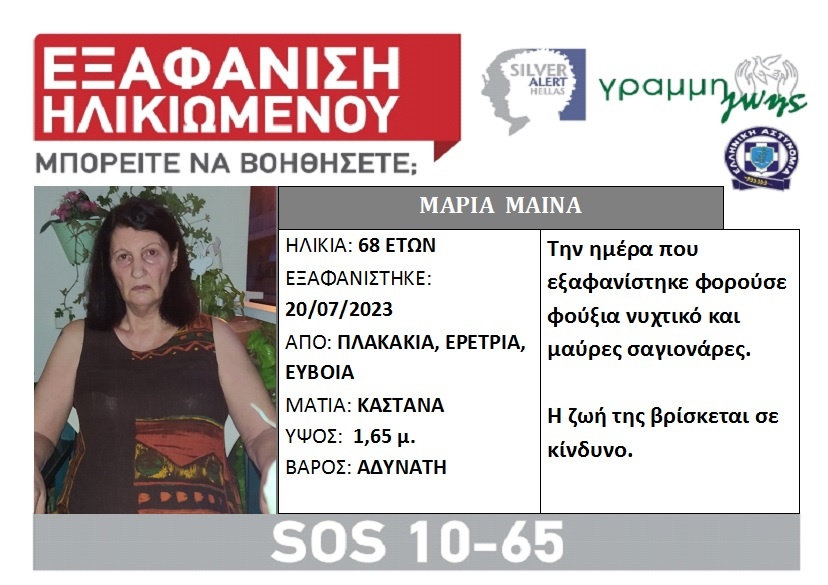 Η Μαρία Μάινα, 68 ετών, εξαφανίστηκε από το σπίτι της μητέρας της, όπου φιλοξενούνταν, στην περιοχή Πλακάκια, Ερέτριας, στην Εύβοια, το απόγευμα της 20/07/23.