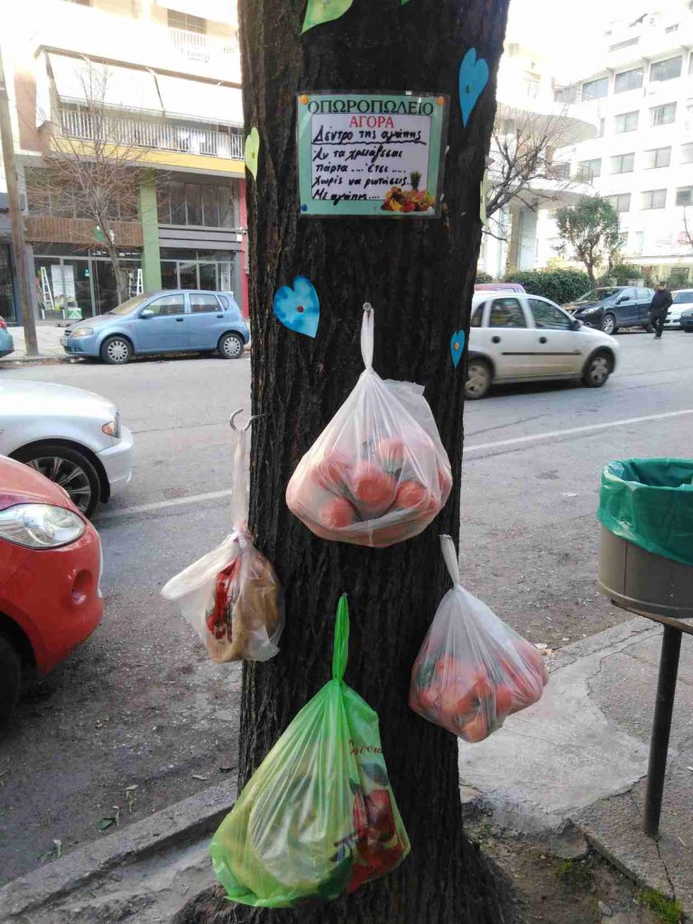 Στο δέντρο μπροστά από το μαγαζί του Κωνσταντίνου Μουτάφη υπάρχει η επιγραφή «Αν τα χρειάζεσαι, πάρτα… έτσι χωρίς να ρωτήσεις. Με αγάπη…». Πάνω στο δέντρο υπάρχουν σακούλες με λαχανικά. Επίσης, στο συγκεκριμένο δέντρο υπάρχουν και σακούλες με φρούτα.
