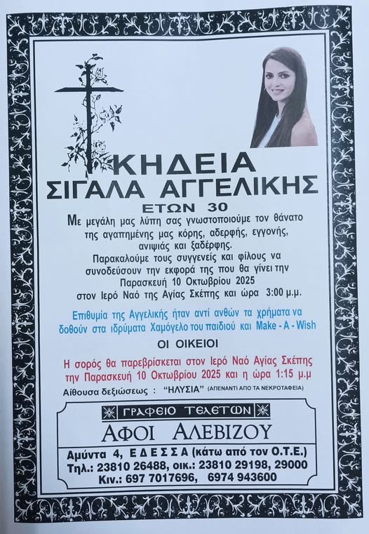 Βαθιά θλίψη έχει σκορπίσει στην τοπική κοινωνία της Έδεσσας η είδηση του πρόωρου χαμού της Αγγελικής Σιγάλα, σε ηλικία μόλις 30 ετών.