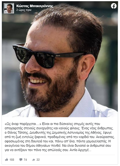 Ο δήμαρχος Αθηναίων Κώστας Μπακογιάννης ανέβασε στο facebook ένα συγκινητικό μήνυμα για τον διευθυντή της Δημοτικής Αστυνομίας της Αθήνας