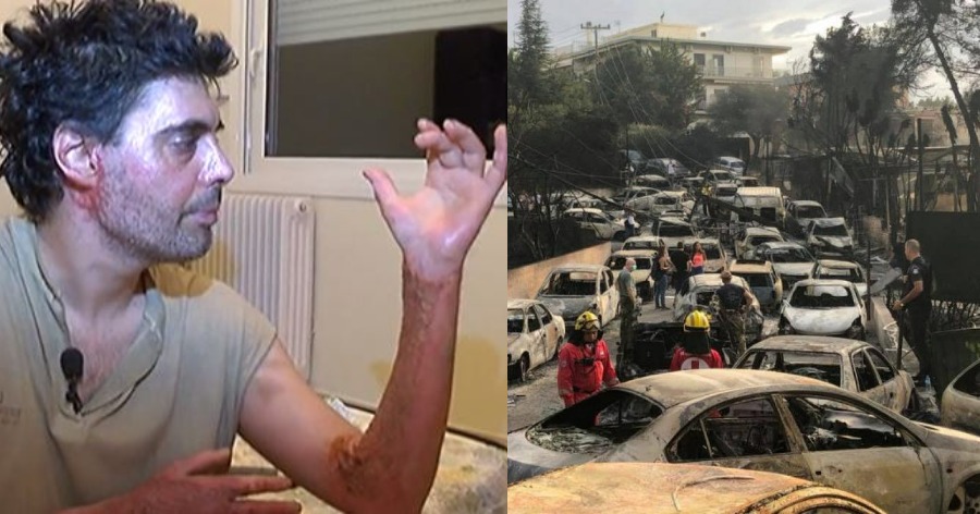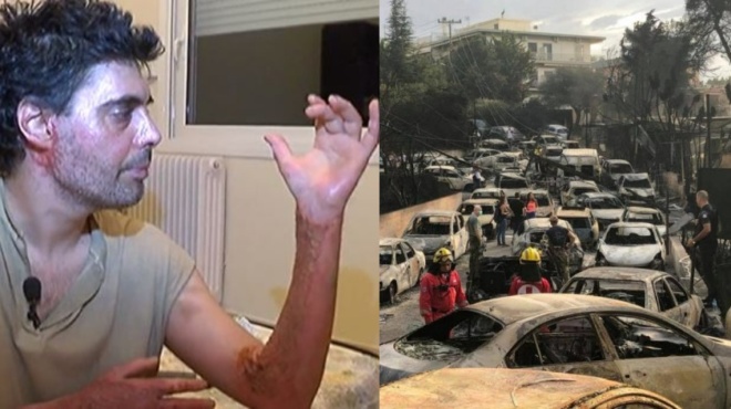Η πλάτη του και τα χέρια του λιώνουν από τη θερμοκρασία σα να είναι κέρινος. Νιώθει πως ψήνεται μέσα σε φούρνο. Τα 150 μέτρα μέχρι το λιμανάκι στο Μάτι μοιάζουν έτη φωτός. Δεν αισθάνεται πλέον πόνο. Έχει περάσει σε άλλη διάσταση. Δε δουλεύει ούτε το μυαλό. Με κοφτές ματιές κοιτάει τα πόδια του. Εχουν λιώσει. Οι μύες είναι ορατοί. Οι φλέβες κρέμονται. Στάζουν αίμα. Δεν υπάρχουν τένοντες. Εχουν μείνει μόνο το κόκκαλα στα πόδια του. Αδυνατούν να κρατήσουν το βάρος του σώματος και καταρρέει μπροστά σε δεκάδες άλλους που τρέχουν αλαφιασμένοι. «Δεν υπήρχε κανείς στο λιμάνι εκτός από πανικόβλητους πολίτες. Αυτά που λένε για οργάνωση είναι ψέμματα», θυμάται ακόμα και τώρα με δυσκολία… Και πως να ξεχάσει;