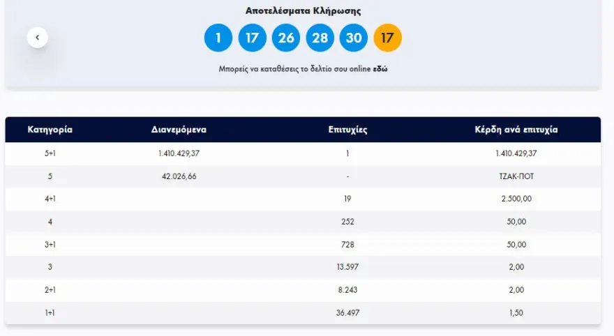 Οι τυχεροί αριθμοί που κληρώθηκαν χθες, ήταν οι 1, 17, 26, 28, 30, με τζόκερ τον αριθμό 17.