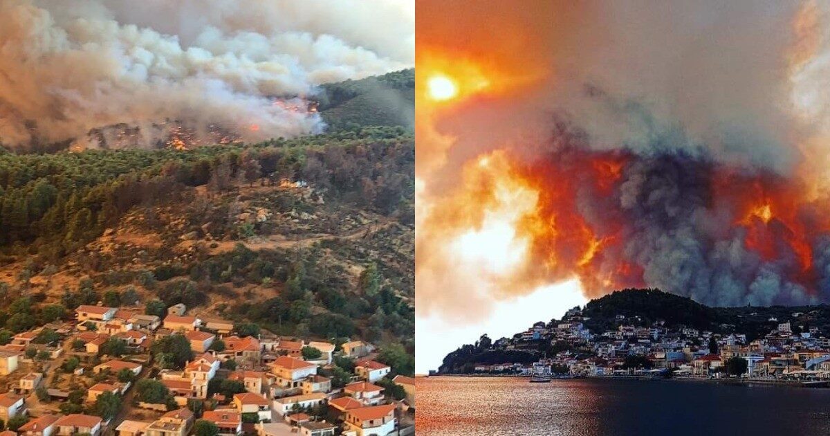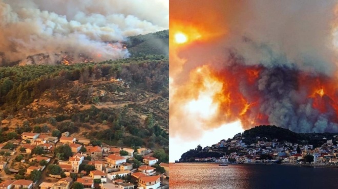 Καίγονται οικισμοί γύρω από τη Λίμνη Ευβοίας, σύμφωνα με το δήμαρχο Μαντουδίου, κ. Γιώργος Τσαπουρνιώτη, ο οποίος έκανε λόγο για «ολοκαύτωμα».