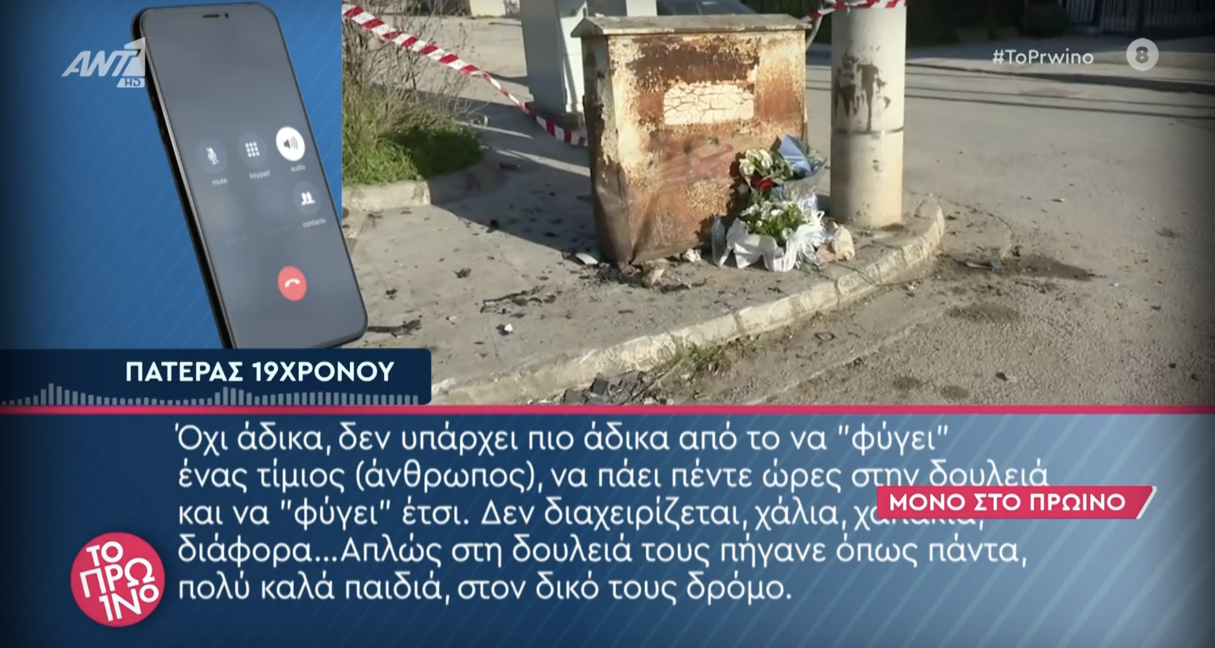 «Δεν υπάρχει πιο άδικα από το να φύγει ένας τίμιος άνθρωπος, να πάει πέντε ώρες στη δουλειά του και να φύγει έτσι. Δεν διαχειρίζεται… Χάλια, χαπάκια, διάφορα… Απλώς στη δουλειά τους πήγανε όπως πάντα, πολύ καλά παιδιά στον δικό τους δρόμο» είπε, συγκλονίζοντας, ο πατέρας του άτυχου παιδιού και πρόσθεσε: «Και με όσους μιλήσεις για τα παιδιά, μόνο τα καλύτερα λένε. Έχω μάθει ότι φταίει ο τραγουδιστής, τι σκ…τά είναι αυτός. Τέλος πάντων, με συγχωρείς για τη φράση. Όχι φταίει… Παρά φταίει! Γρήγορα, με ταχύτητα. Χωρίς φρένα, έπεσε και έφαγε σχεδόν δύο ζωές. Όχι μία. Και τους υπόλοιπους που έχει πίσω, τα τραύματα που μας έχει αφήσει. 19 χρονών, σε δύο μήνες θα πήγαινε στα 20».