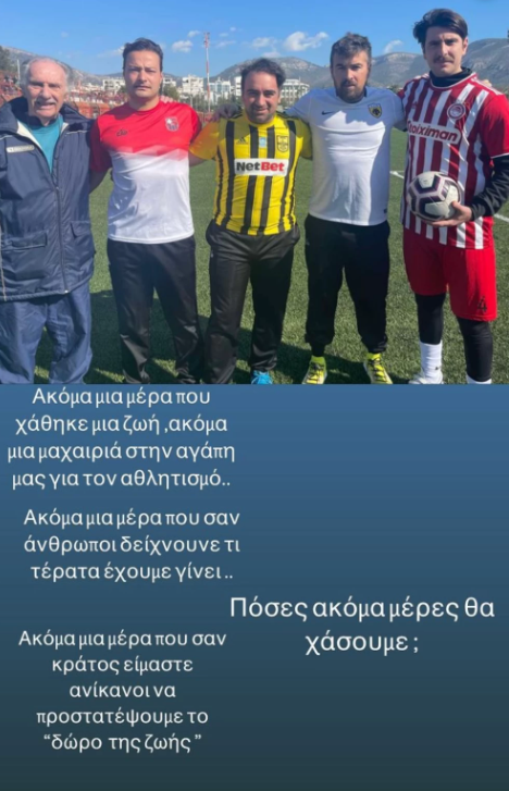 «Ακόμη μια μέρα που χάθηκε μια ζωή, ακόμη μια μαχαιριά στην αγάπη μας για τον αθλητισμό. Ακόμη μια μέρα που σαν άνθρωποι δείχνουμε τι τέρατα έχουμε γίνει. Ακόμη μια μέρα που σαν κράτος είμαστε ανίκανοι να προστατέψουμε το δώρο της ζωής. Πόσες ακόμα μέρες θα χάσουμε;», έγραψε ο Γιώργος Γεροντιδάκης.