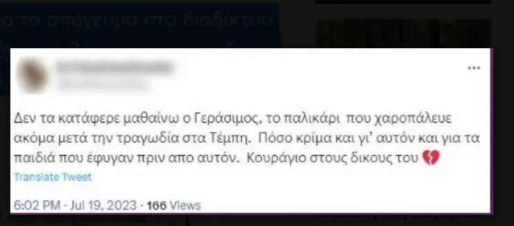 Η θεία του 20χρονου θέλησε να βάλει τα πράγματα στη θέση τους και με ανάρτησή της στο Facebook ξεκαθάρισε: «Η δημοσίευση που κυκλοφορεί στα social για τον Γεράσιμο δεν ισχύει. Σας παρακαλώ να κατέβει. Αντιθέτως και δόξα το Θεό, μετά από πολύ καιρό… σήμερα είναι απύρετος».