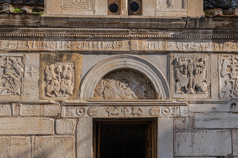 Το βλέμμα του όμως τράβηξε κυρίως η ζωφόρος από ένα άγνωστης ταυτότητας ερειπωμένο κτίσμα πιθανόν του 2ου ή 1ου αι. π.Χ. Και θέλησε να την τοποθετήσει στην πρόσοψη. Μόνο που υπήρχαν δύο προβλήματα. Πρώτον, το ανάγλυφο είχε μήκος 6 μ. και ο ναός μόλις 5 μ. οπότε αναγκάστηκε να το κόψει. Και δεύτερον, δεν γνώριζε το θέμα που απεικονιζόταν στη ζωφόρο με αποτέλεσμα να τοποθετήσει τις μορφές με λάθος σειρά, ενώ σε μία προσέθεσε τρεις σταυρούς (όπως και σε αρκετές άλλες παραστάσεις) για να την εκχριστιανίσει!