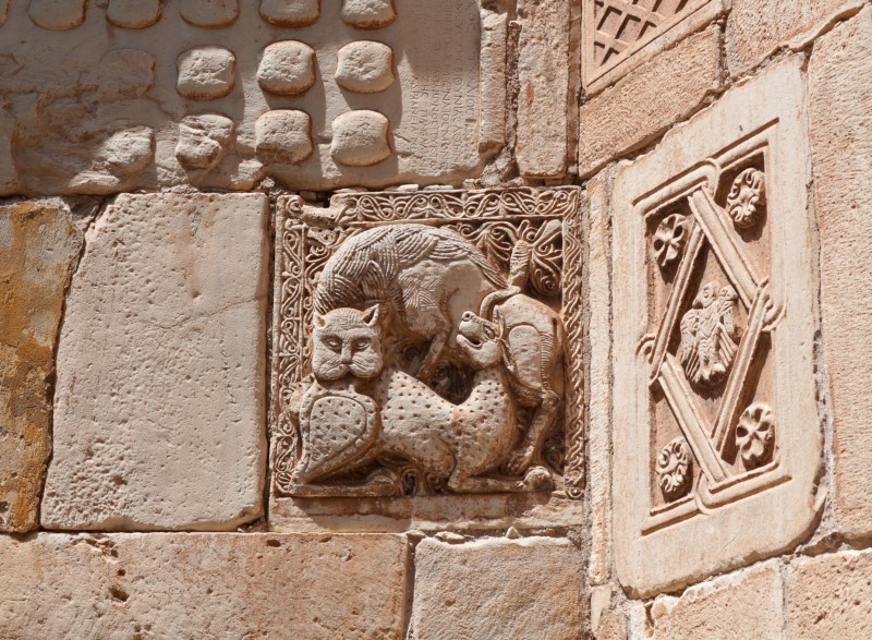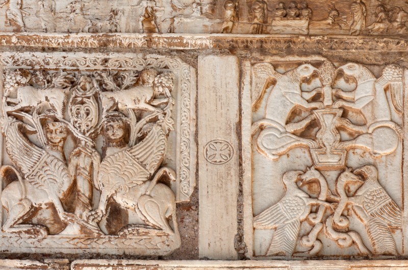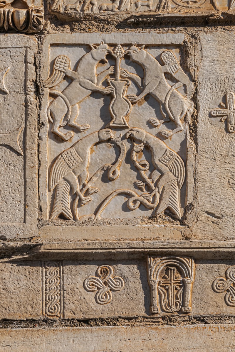 Για τους τοίχους του σταυροειδούς εγγεγραμμένου με τρούλο ναού χρησιμοποίησε μαρμάρινους λίθους κυρίως χωρίς διακόσμηση, ενώ στα πιο ψηλά σημεία λιοντάρια, αετοί και γυναικείες μορφές κοσμούν πολλές από τις 90 ανάγλυφες πλάκες που αξιοποιήθηκαν, δημιουργώντας έτσι ένα μικρό υπαίθριο μουσείο γλυπτικής.