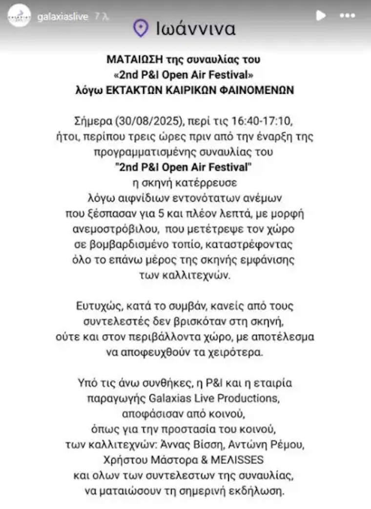 «Ματαίωση της συναυλίας του “2nd P&I Open Air Festival» λόγω έκτακτων καιρικών φαινομένων.