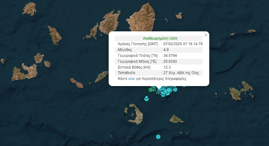 Στις 09:16 το πρωί της Παρασκευής, σημειώθηκε ισχυρός σεισμός 4,8 βαθμών της κλίμακας Ρίχτερ. Σύμφωνα με το Γεωδυναμικό Ινστιτούτο του Εθνικού Αστεροσκοπείου Αθηνών, το επίκεντρο του σεισμού εντοπίστηκε 24 χλμ. βόρεια της Ανάφης και το εστιακό του βάθος ήταν στα 5 χλμ.