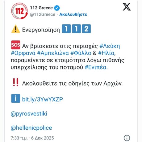 «Αν βρίσκεστε στον οικισμό της Υπέρειας της Περιφερειακής Ενότητας Λάρισας, απομακρυνθείτε προς την πόλη των Φαρσάλων λόγω υπερχείλισης του ποταμού Ενιπέα. Ακολουθείτε τις οδηγίες των Αρχών», αναφέρεται στο μήνυμα.