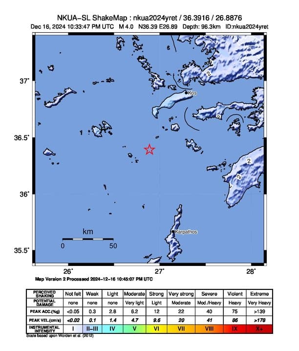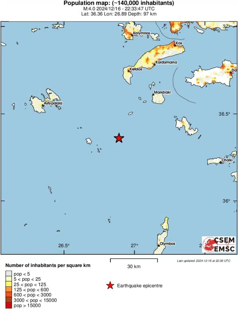 Σεισμική δόνηση 4 βαθμών της κλίμακας Ρίχτερ στον θαλάσσιο χώρο 31 χιλιόμετρα νοτιοδυτικά της Νισύρου, ή 333 χλμ. ανατολικά-νοτιοανατολικά της Αθήνας.