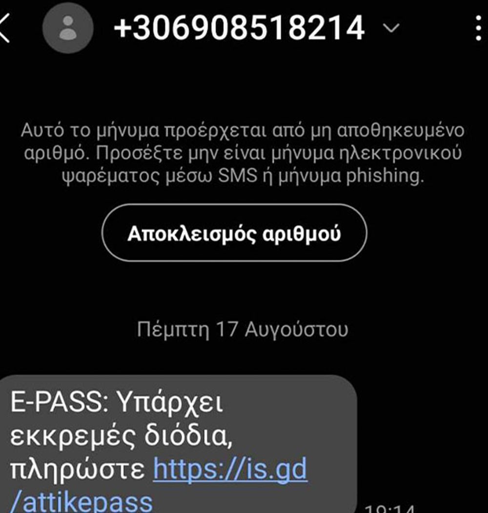 Το SMS που φθάνει στον ανύποπτο χρήστη, τον καλεί να πληρώσει «εκκρεμές διόδια» (sic) για το E-Pass της Αττικής Οδού, ενώ σ’ ένα άλλο, φαίνεται ότι ο χρήστης οφείλει 2,80 ευρώ στην Αττική Οδό και ζητά μάλιστα να το πληρώσει ASAP (όσο πιο γρήγορα γίνεται).