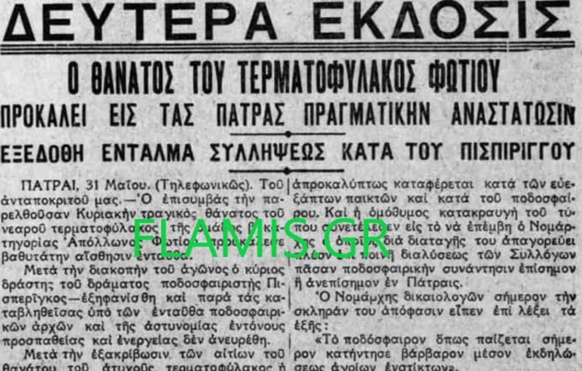 «Κατά το 6ο λεπτό ο Πισπιρίγκος του Εθνικού τριπλάρων τρεις διαδοχικώς αντιπάλους ευρέθη μόνος προ του τερματοφύλακος Φωτίου εις απόστασιν 7-8 μέτρων. Πλην λόγω της ταχύτητας του η μπάλα του ξέφυγε κατά 2-3 μέτρα. Τότε ο τερματοφύλαξ και κυνηγός ώρμησαν προς αυτήν και την επλησίασαν ταυτοχρόνως. Ο Φωτίου ευρισκόμενος εις μεγαλυτέραν απ’ αυτής απόστασιν έκαμε πλονζόν ταχύτατον και καθ’ ην στιγμήν συνελάμβανε τη μπάλα εδέχετο κτύπημα του Πισπιρίγκου, επιχειρίσαντος να σουτάρει, εις το στήθος. Ο τελευταίος εσωριάσθη λόγω της ταχύτητος του εις ικανήν απόστασιν ενώ ο Φωτίου έμενε άπνους με την μπάλα αγκαλιασμένη….Ο αγών διακόπη και ο παρευρισκόμενος ιατρός κ. Μπίμπης, μέλος του Δ.Σ. της Ε.Π.Σ.Πατρών επιστοποίησε τον θάνατον του ατυχούς τερματοφύλακος. Η γενομένη νεκροψία απέδειξε ότι το κτύπημα του στήθους ήτο ισχυρότατον και επέφερε συγκοπήν της καρδίας του παθόντος»!