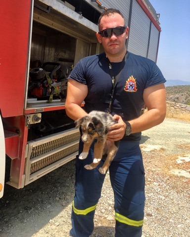 Ακολουθεί φωτογραφία από το ετοιμοθάνατο σκυλάκι, με άνδρα του Πυροσβεστικού Σώματος:
