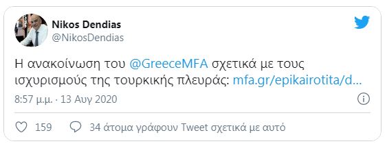 «Τους προειδοποιήσαμε ότι θα το πληρώσουν ακριβά αν επιτεθούν στο Oruc Reis στην Ανατολική Μεσόγειο και σήμερα πήραν την πρώτη απάντηση», δήλωσε συγκεκριμένα ο Ερντογάν. Η απάντηση, λοιπόν, από το ελληνικό ΥΠΕΞ είναι η εξής: «Σχετικά με ισχυρισμούς της τουρκικής πλευράς, ο Υπουργός Εξωτερικών Νίκος Δένδιας θα ενημερώσει τους ομολόγους του στο αυριανό έκτακτο Συμβούλιο των Υπουργών Εξωτερικών της Ε.Ε., μεταξύ άλλων, για τα πραγματικά γεγονότα των τελευταίων ημερών ως προς τα επιχειρησιακά συμβάντα στην περιοχή».
