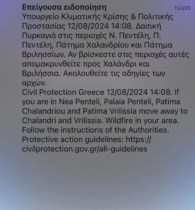 Δύο μηνύματα ακόμη εστάλησαν από το 112 για να απομακρυνθούν οι κάτοικοι από τις περιοχές του Σπατατζικίου (Πευκόφυτο) Μαραθώνα, αλλά και από τη Νέα και την Παλαιά Πεντέλη, το Πάτημα Χαλανδρίου και το Πάτημα Βριλησσίων. Από αυτές τις περιοχές οι κάτοικοι ζητείται να απομακρυνθούν προς Χαλάνδρι και Βριλήσσια.