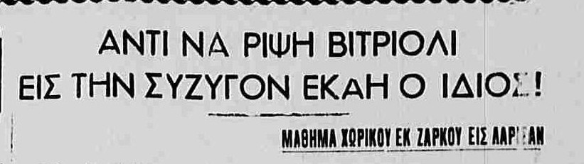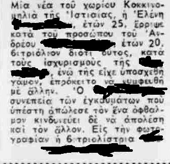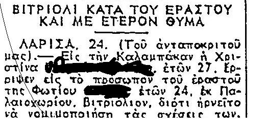 Την ίδια μέρα, στην εφημερίδα “Ελευθερία”, ρεπορτάζ αναφέρονταν σε κοπέλα στη Λάρισα που έριξε βιτριόλι στον εραστή της, με το καυστικό υγρό να μην σημαδεύει μόνο εκείνον, αλλά να βρίσκει και ανυποψίαστη γυναίκα που είχε την ατυχία να περνά εκείνη την ώρα από δίπλα τους.