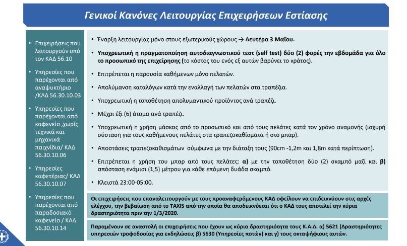 - Οι εργαζόμενοι στον κλάδο της εστίασης θα υποβάλλονται υποχρεωτικά δύο φορές την εβδομάδα σε self tests. Το κόστος για το ένα self test θα καλύπτεται από το κράτος, ενώ για το άλλο το κόστος θα καλύπτεται από τον εργοδότη.