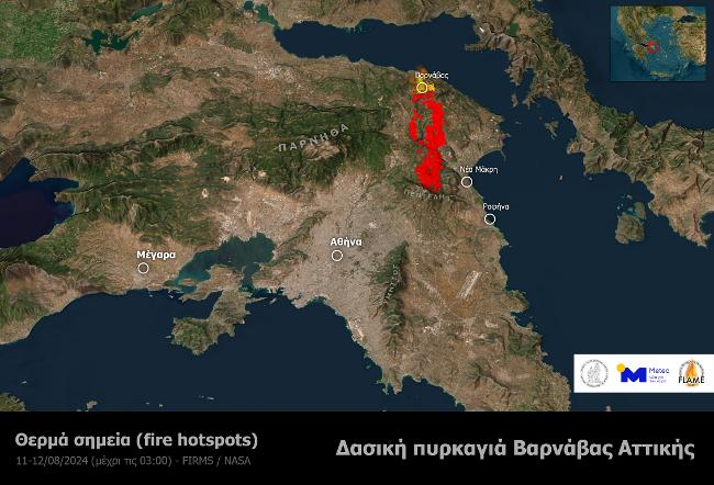 Εικόνα 1. Τα θερμά σημεία της πυρκαγιάς που ανιχνεύθηκαν από δορυφόρους πολικής τροχιάς μέχρι τις πρώτες πρωινές ώρες (03:00 της Δευτέρας 12 Αυγούστου 2024).