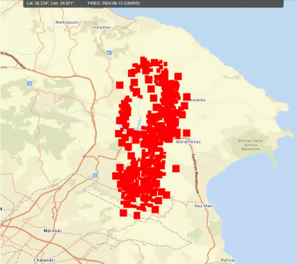 Εικόνα 2. Τα θερμά σημεία της πυρκαγιάς που ανιχνεύθηκαν από δορυφόρους πολικής τροχιάς μέχρι και το μεσημέρι (13:00 Δευτέρας 12 Αυγούστου 2024).