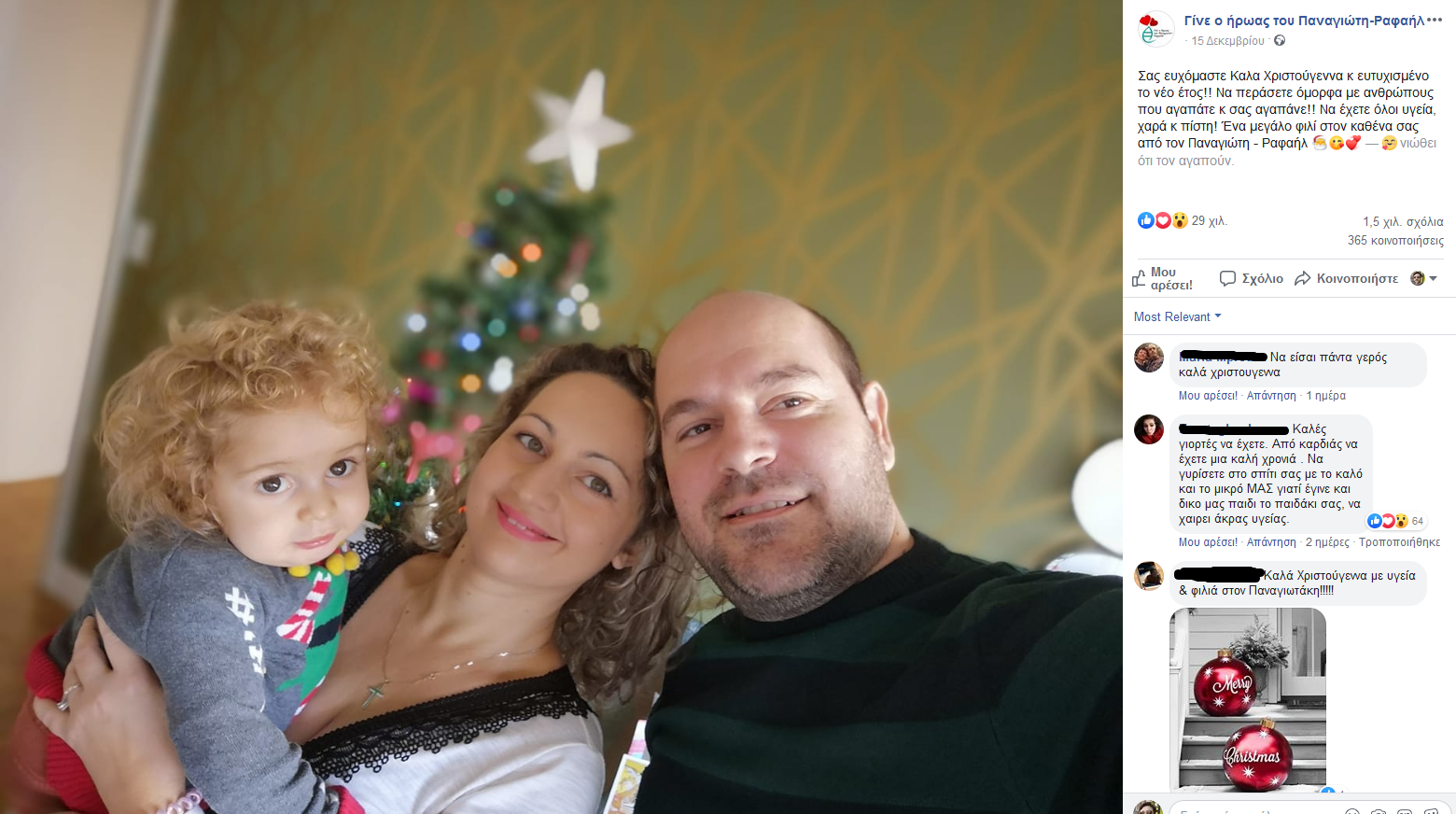 «Σας ευχόμαστε Καλά Χριστούγεννα κ ευτυχισμένο το νέο έτος!! Να περάσετε όμορφα με ανθρώπους που αγαπάτε κ σας αγαπάνε!! Να έχετε όλοι υγεία, χαρά κ πίστη! Ένα μεγάλο φιλί στον καθένα σας από τον Παναγιώτη – Ραφαήλ», έγραψαν, πριν από λίγες ημέρες, σε ανάρτησή τους στη σελίδα «Γίνε ο ήρωας του Παναγιώτη – Ραφαήλ» στο Facebook οι γονείς του παιδιού.
