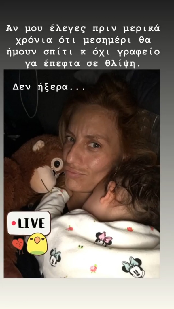 «Αν μου έλεγες πριν μερικά χρόνια ότι μεσημέρι θα ήμουν σπίτι και όχι γραφείο θα έπεφτα σε κατάθλιψη. Δεν ήξερα», έγραψε χαρακτηριστικά. Αναμφίβολα μία πολύ τρυφερή εξομολόγηση από την παρουσιάστρια.