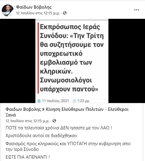 «Χριστόδουλε αυτοί σε διαδέχθηκαν. Φασισμός προς κληρικούς και ΥΠΟΤΑΓΗ στην κυβερνηση απο την Ιερά Σύνοδο» έγραψε αναφερόμενος στη στάση της εκκλησίας να υποστηρίξει τον εμβολιασμό στην Ελλάδα.