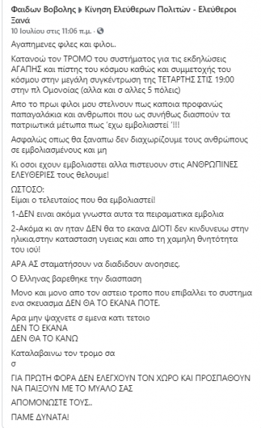 Τη διαμαρτυρία κατά του εμβολιασμού διοργάνωσε, μέσω των μέσων κοινωνικής δικτύωσης ο καρδιολόγος Φαίδων Βόβολης, επικεφαλής του κινήματος «Ελεύθεροι Ξανά».