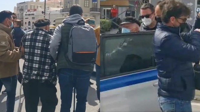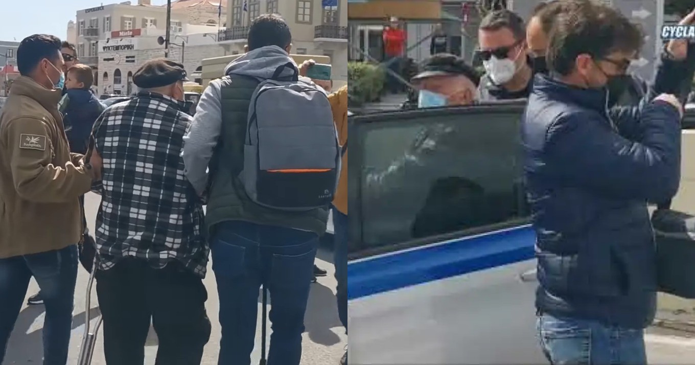 Με έντονες αποδοκιμασίες ήρθε αντιμέτωπος ο 90χρονος που σκότωσε τον γείτονά του. Μεταφέρθηκε στη Σύρο, για να βρεθεί ενώπιον του Εισαγγελέα Πρωτοδικών και των ανακριτικών αρχών. Υποβασταζόμενος και μαγκούρα έφθασε νωρίς το απόγευμα της Δευτέρας στο νησί.