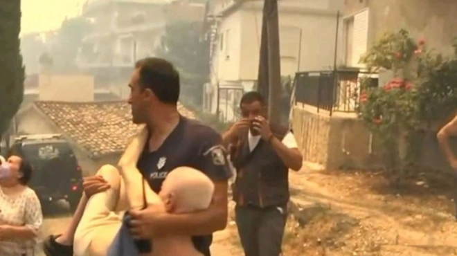 Πυροσβέστες και κάτοικοι της περιοχής επιχειρούν να απομακρύνουν από τις φλόγες έναν ηλικιωμένο άνδρα.