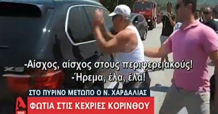 Ένας κάτοικος χτύπησε τα τζάμια του αυτοκινήτου, φωνάζοντας «αίσχος, αίσχος» και τον υφυπουργό να ανοίγει την πόρτα εκνευρισμένος! Ένταση το μεσημέρι στις Κεχριές, στην Κόρινθο, όπου μαίνεται η μεγάλη πυρκαγιά, με τον υφυπουργό Πολιτικής Προστασίας Νίκο Χαρδαλιά να πηγαίνει το μεσημέρι στο σημείο, μαζί με τον αρχηγό της πυροσβεστικής, προκειμένου να συντονίσουν το έργο της κατάσβεσης.