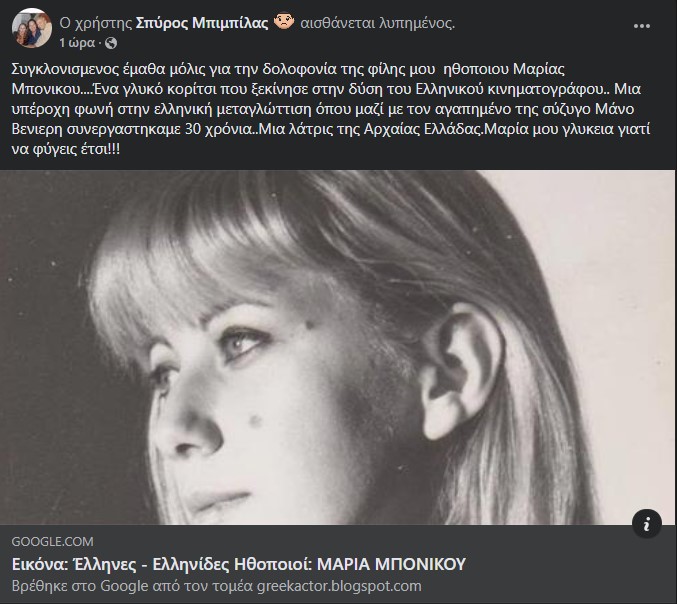 Σύμφωνα με το newsit.gr, αλλά και την ανάρτηση που έκανε μέσα από την προσωπική του σελίδα στο Facebook, ο πρόεδρος του ΣΕΗ, Σπύρος Μπιμπίλας η γυναίκα που έφυγε από τη ζωή ήταν η ηθοποιός Μαρία Μπονίκου.